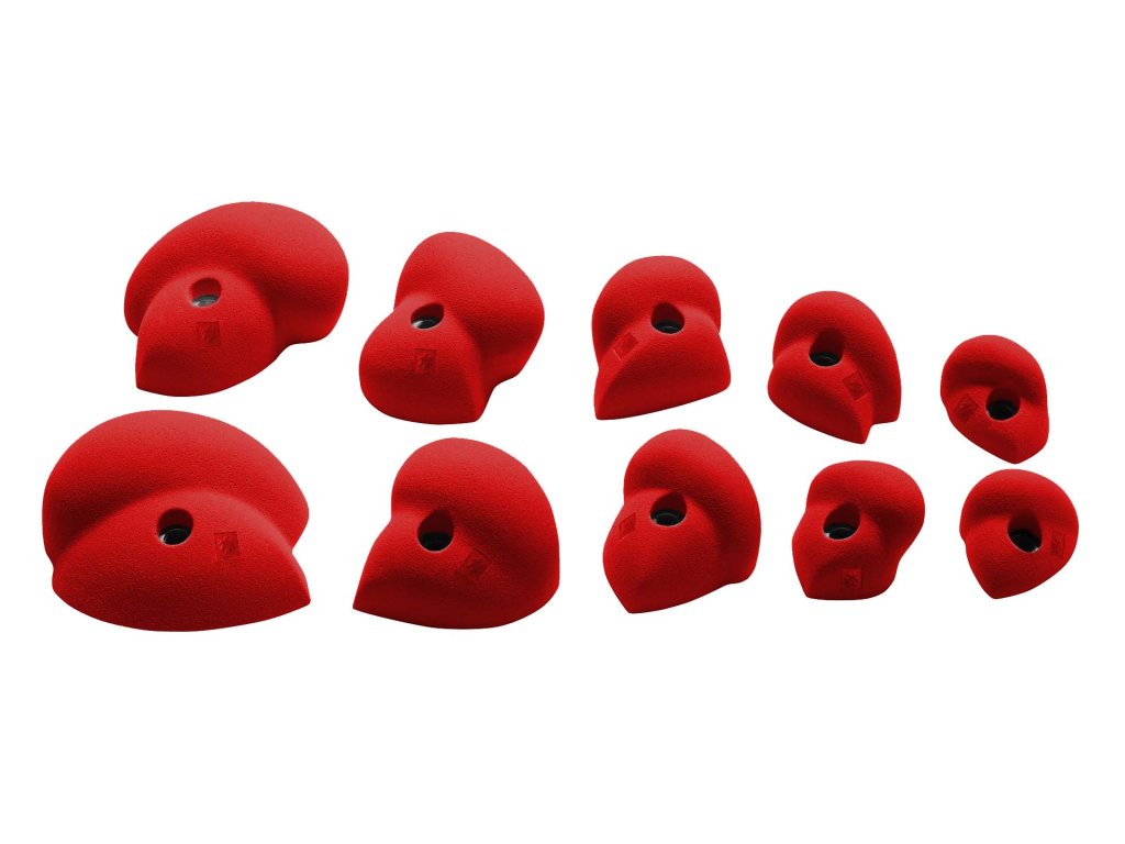 Sada různě velkých chytů ve tvaru madla pro tvorbu cest na domací tréninkové stěně.